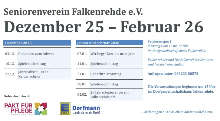 Das wünschen wir uns natürlich für alle unsere Gruppen, Vereine und die Orte und Gelegenheiten, bei denen wir zusammenkommen. Und hier ist einiges zu erwarten, begeht doch der Seniorenverein am 04. Februar seinen zwanzigsten Geburtstag und kann sich für langjähriges, erfolgreiches Engagement für die Senioren im Ortsteil und weit über seine Grenzen hinaus feiern lassen. Erstmal aber startet er gelassen, am heutigen Mittwoch wird um 15.00 Uhr im Saal des Dorfgemeinschaftshauses das Neue Jahr begrüßt und am 21.01.2026 widmen sich die Senioren dem Gedächtnistraining, dazwischen finden jeden Mittwoch die Spielenachmittage statt. Den Halbjahresplan finden Sie hier