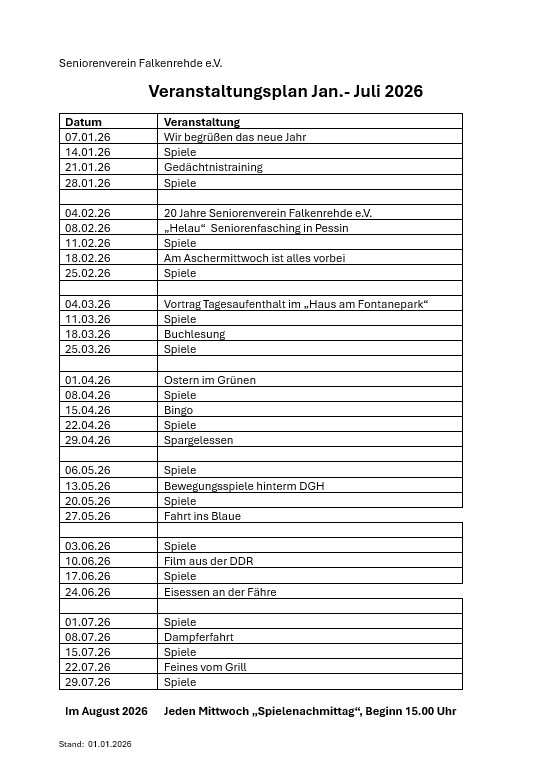 Informationen zur Vereinsarbeit entnehmen Sie bitte auch den Aushängen im Schaukasten an der alten Schule. Die Senioren aus Falkenrehde und Neu Falkenrehde sind zu diesen Veranstaltungen herzlich eingeladen.